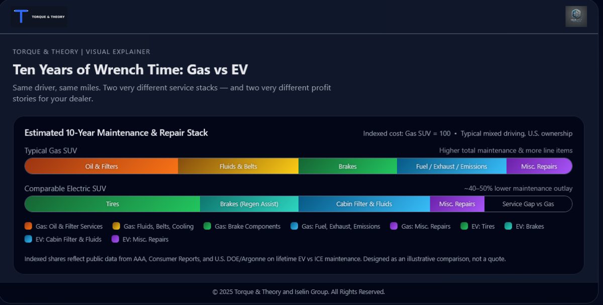 Com o tempo, um proprietário leal de um carro a gasolina torna-se uma anuidade. A cada 5.000–7.500 milhas, você volta. O departamento de serviço recebe horas de mão de obra, marcação de peças e uma nova chance de “encontrar” algo que precise de atenção. Esse negócio repetido está incluído no planejamento da concessionária. Retire aquela pilha de visitas de manutenção de carros a gasolina e o modelo começa a oscilar.